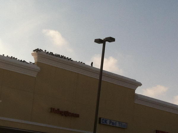 that live pigeons on the left side of photo remain, BUT all plastic pigeons